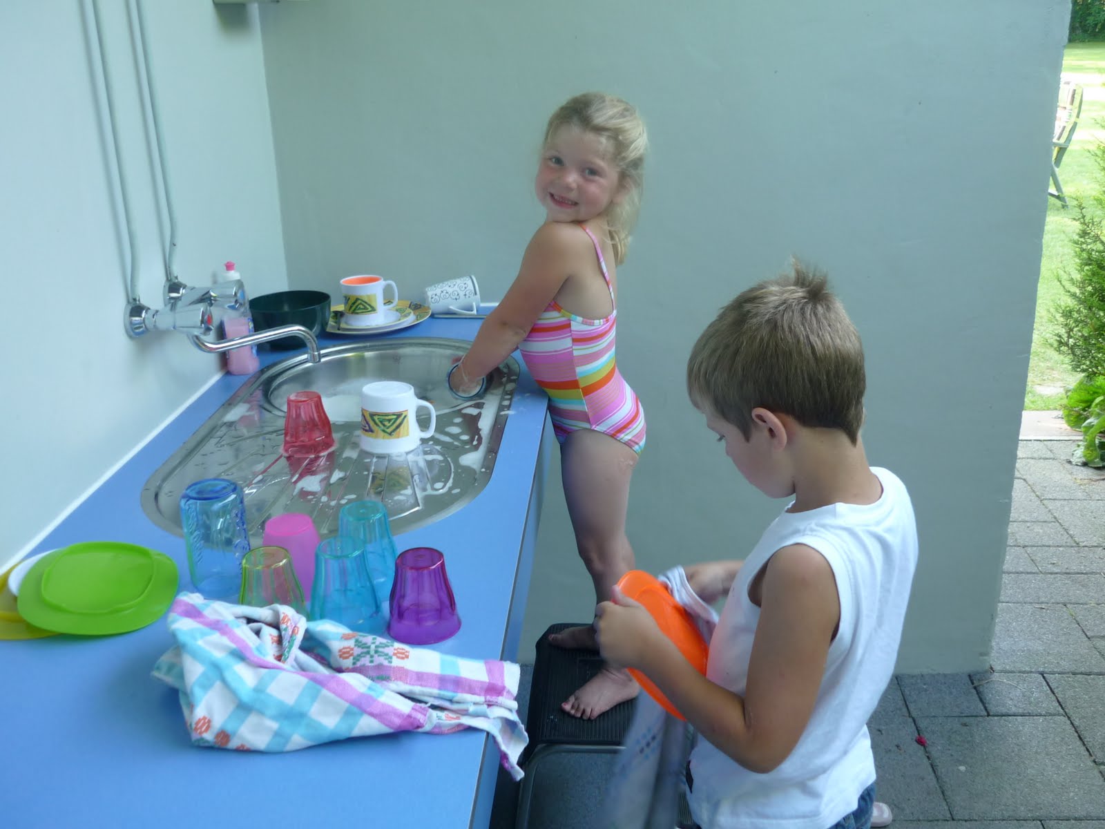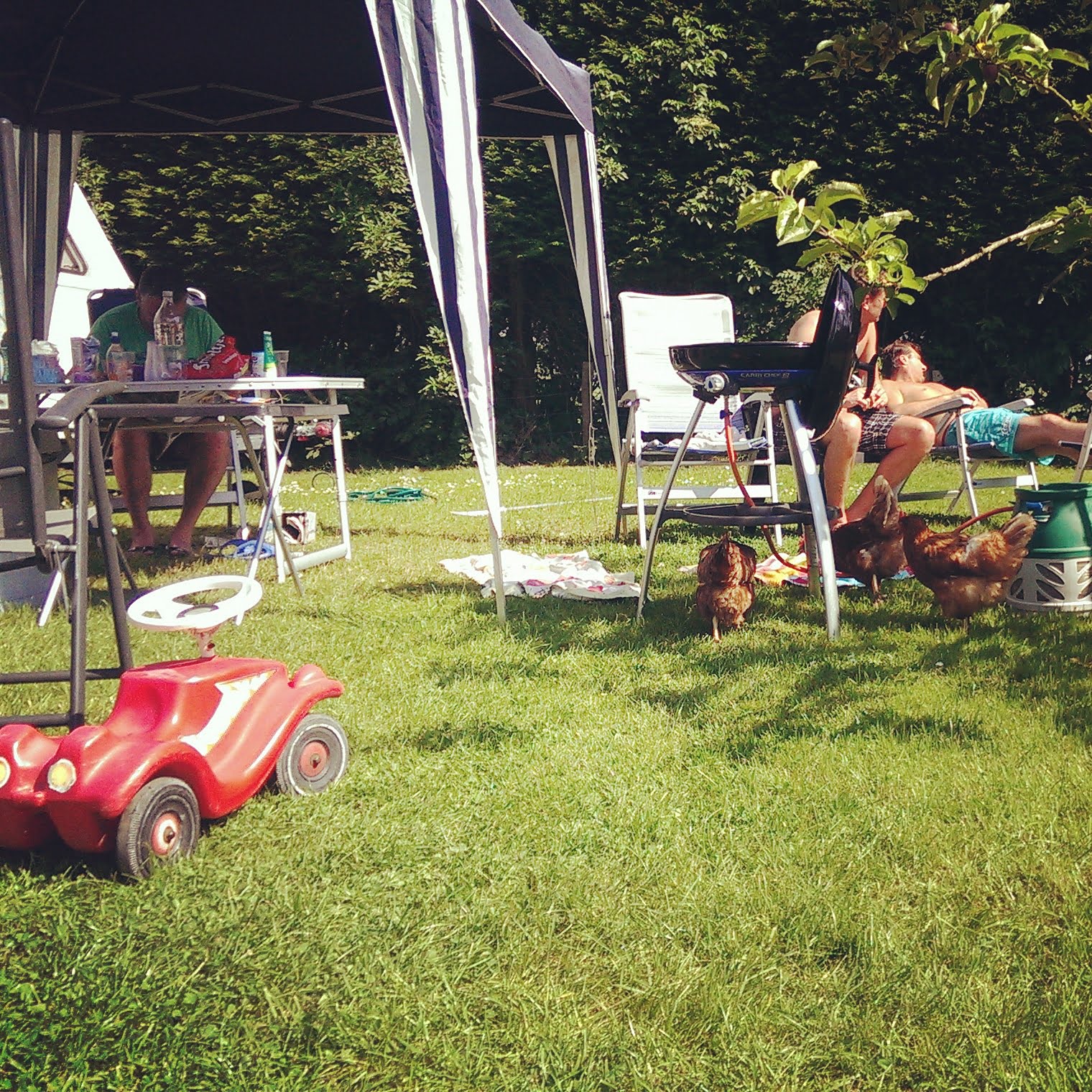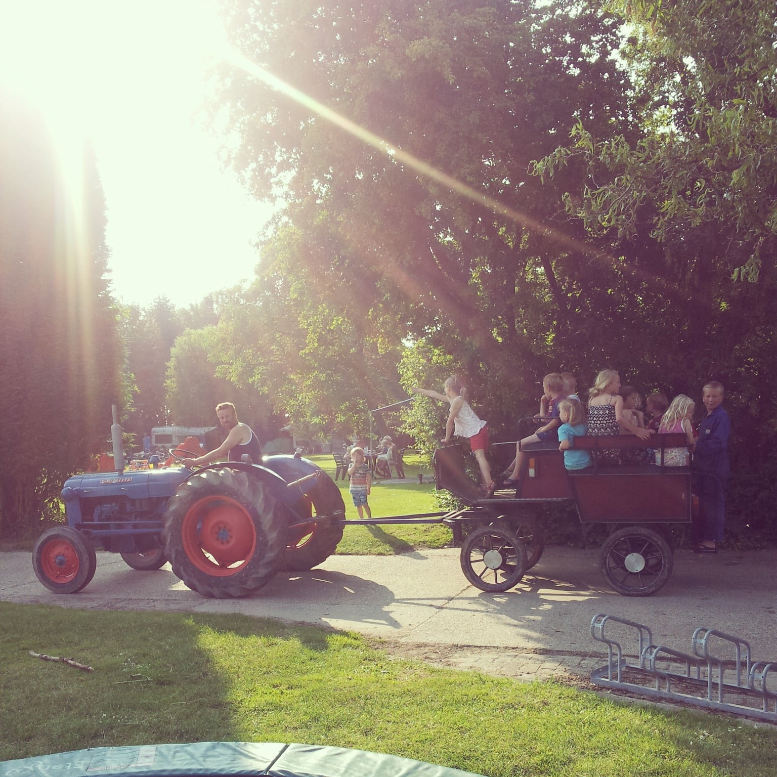 De wagen staat op onze boerderijcamping tussen oude fruitbomen, tussen de andere kampeerders in. Alle gezelligheid van het kamperen dus! Dit veld heeft een zandbak/glijbaan in het midden, dus goed in het zicht.