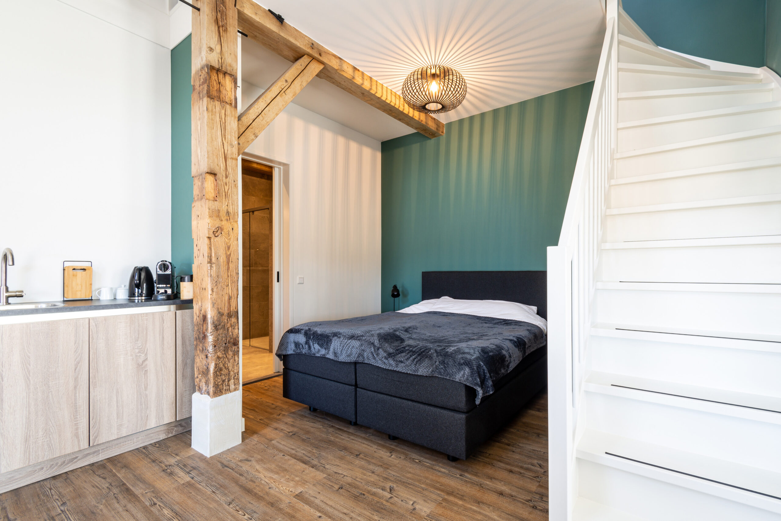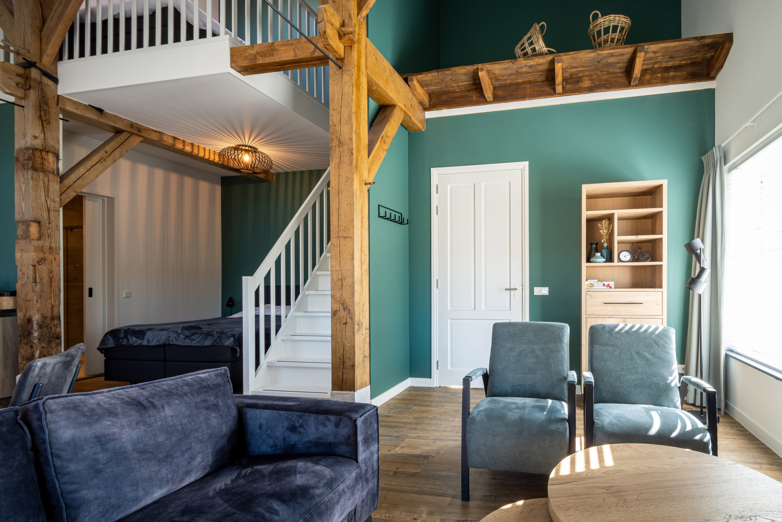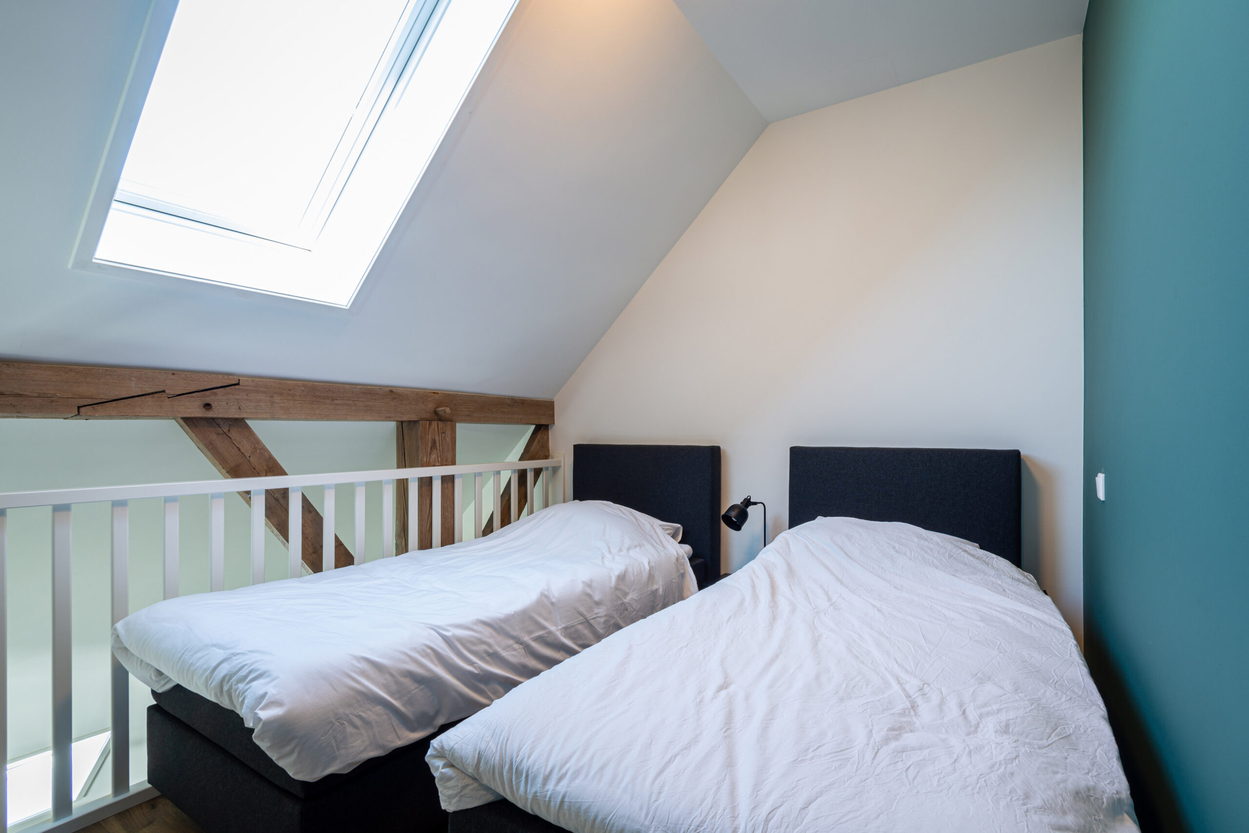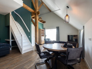Boven bevindt zich via een prachtige open trap 2x een 1-persoonsbed. Beneden is een tweepersoonsbed.