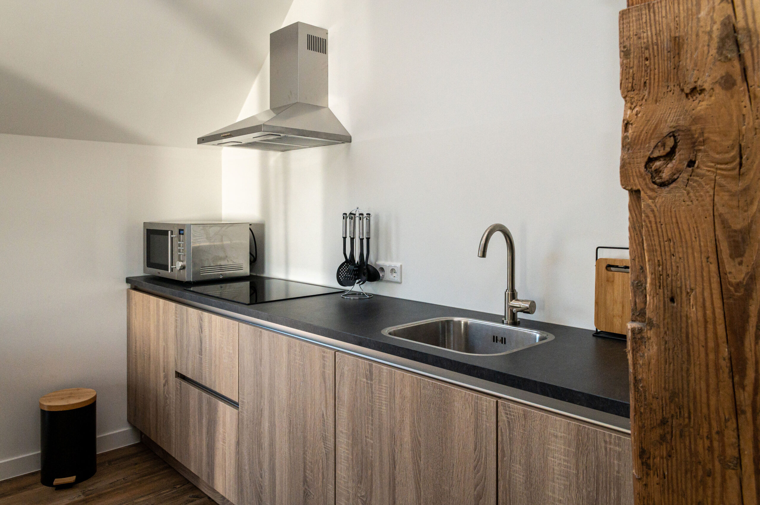 Verder beschikt de kamer over een moderne keuken met de benodigde kook- en bakpannen en een handdoekenpakket. De keuken is voorzien van een vaatwasser, waterkoker, Nespresso apparaat, koelkast, inductie kookplaat en combimagnetron.